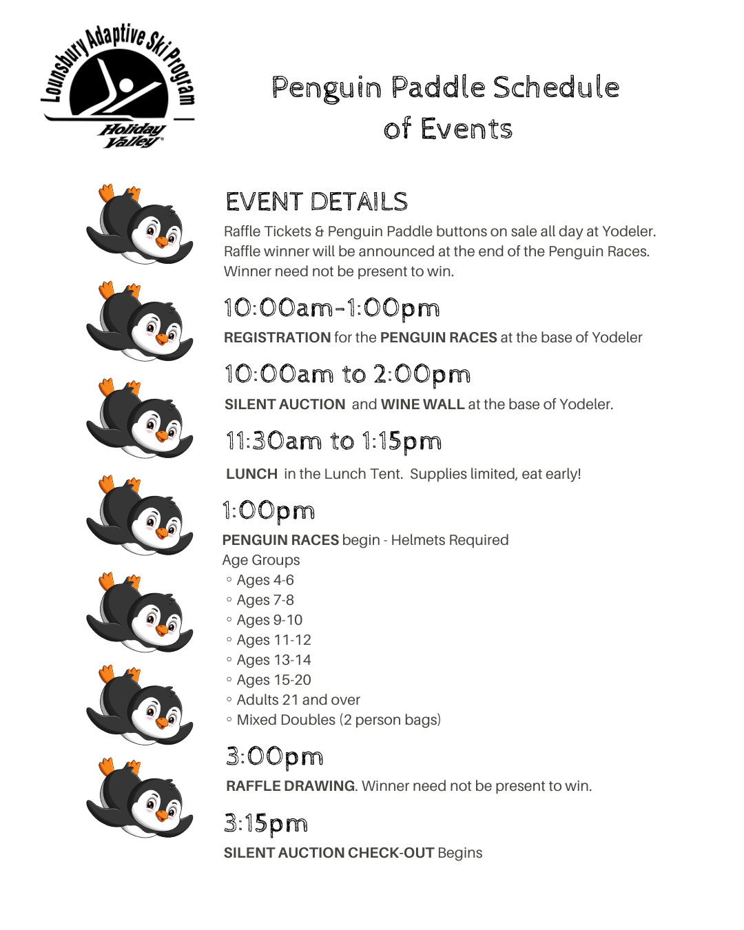 The annual Penguin Paddle is an all-day event that is held on the slope-side of the Yodeler lodge in cooperation with Holiday Valley Ski Resort. Most of the students who participate in LASP require specially designed adaptive equipment which is very expensive. The proceeds from Penguin Paddle help to purchase and maintain this equipment and to fund ongoing adaptive training programs for the 40 volunteer instructors.